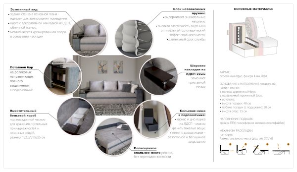 Материал каркаса: ЛДСП (Kronospan, класс Е1), ХДФ (Kronospan, класс Е1), Березовая фанера 4 мм, Строганный брус хвойных пород дерева
