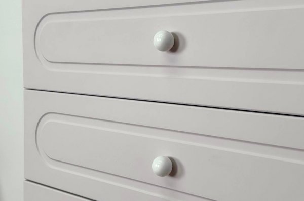 Корпус комода выполнен из ЛДСП толщиной 16 мм, фасады изготовлены из МДФ в плёнке ПВХ. Фасады с фрезеровкой подчёркивают аккуратный внешний вид изделия. Оригинальные круглые ручки и опоры придают комоду современный и лёгкий характер, делая его гармоничной частью детского интерьера.