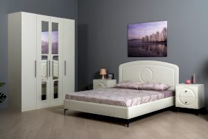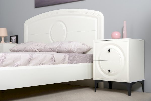 Кровать установлена на высокие ножки, что делает конструкцию лёгкой и воздушной, изголовье кровати декорировано фрезеровкой. Матрас укладывается на ортопедическое основание с гнутоклееными ламелями.
