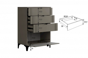 Комод изготовлен из качественных материалов: корпус выполнен из ЛДСП, что гарантирует прочность и долговечность, а фасад, выполненный из МДФ в плёнке ПВХ, не только выглядит эстетично, но и защищает комод от повреждений. Особое внимание заслуживает фрезеровка фасадов, которая придаёт изделию изысканный вид.